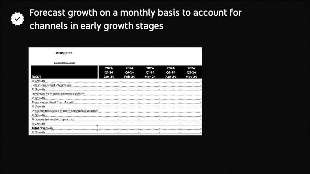 - Model your channel's growth on a monthly basis to account for early-stage growth curves.