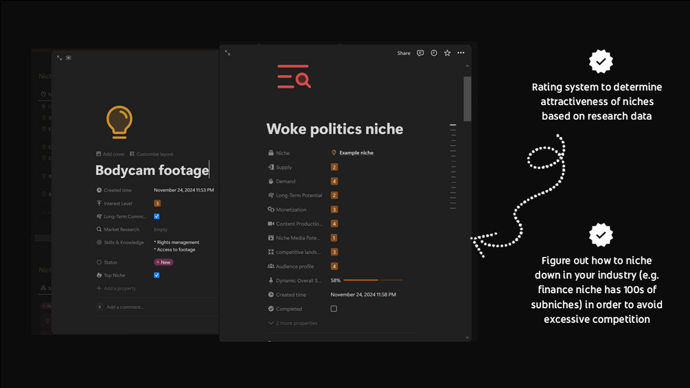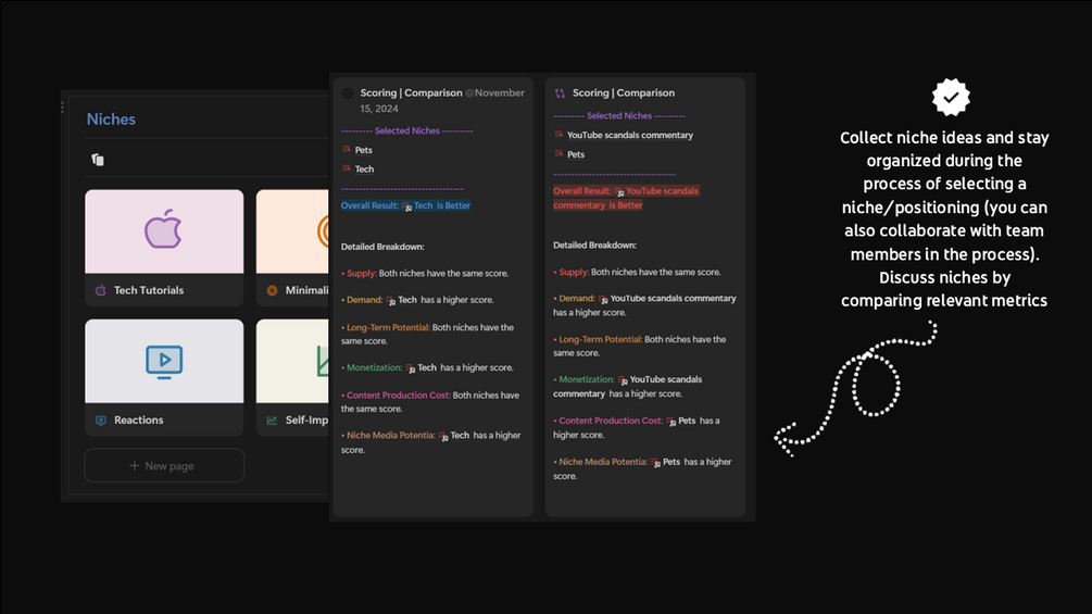 ✅ Data-Driven Decisions: Evaluate niches based on supply and demand, long-term potential, monetization potential, production cost, and audience insights.